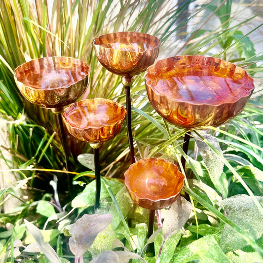 Set of 5 Copper Crinkle Cut Rain Catcher Sculptures with Curvy Iron Stakes