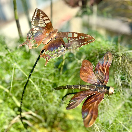 Set of 2 Copper Garden Sculptures – Butterfly & Dragonfly on 80 cm Poles – Save £10